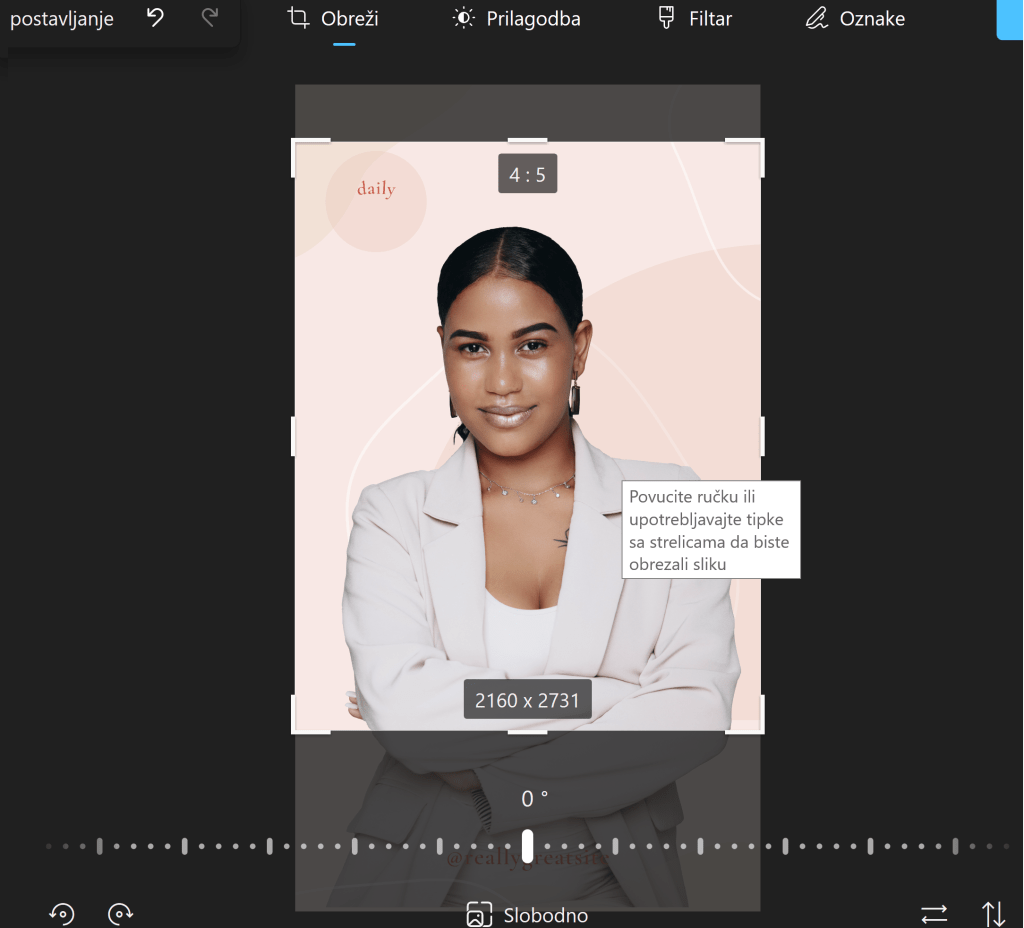 Najprije izrežemo fotografiju tako da u fokusu bude lice i gornji dio tijela Ukoliko odaberete fotografiju cijelog tijela, takva će fotografija biti vidljiva i u konačnom koraku. Zato sam ja najprije “izrezala” dio fotografije koji mi ne treba i stavila u fokus lice i gornji dio tijela, što najbolje prolazi kod profilnih fotografija.