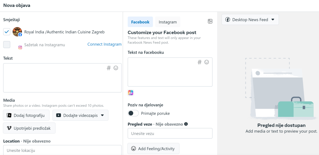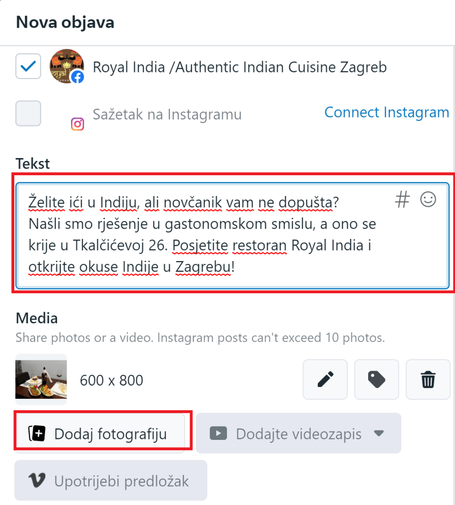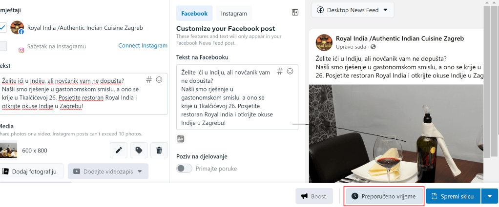 Priprema objave koja će biti zakazana Ovdje sam pisala o tome kako ljudi ne trebaju ići u Indiju kako bi probali okuse njihove kuhinje, već mogu otići u ovaj indijski restoran za puno manje novaca i okusiti Indiju u Zagrebu. Obavezno na kraju stavite tzv. CTA (call to action) – poziv na akciju koji bi trebao rezultirati onime što želimo (a u većini slučaja je to ostvarenje prodaje). U našem slučaju, dolaskom ljudi u restoran koji će tamo jesti.