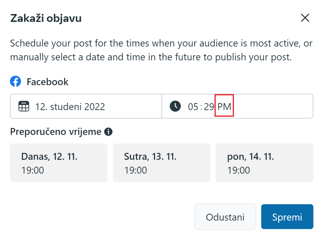 Odabir vremena u kojem će sadržaj biti plasiran na kanal U ovom koraku treba paziti da se željeno vrijeme objave označi s pravilnim oznakama koje se odnose na jutro/dan i popodne/večer. Moja objava objavit će se u 17:29 sati, što je na Facebooku označeno kao 05:29 PM.