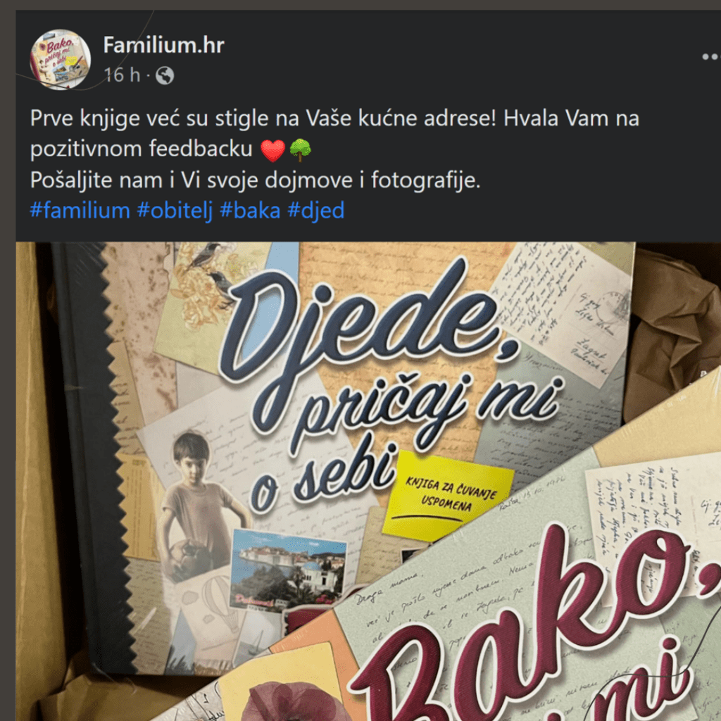 Izvor: Familium Facebook stranica Ovaj proizvod je rezultat izvrsne ideje koja rezultira win win situacijom (situacijom u kojoj su obje strane na dobitku). Nakon zabilježavanja uspomena naših baka i djedova stvaramo povezaniji odnos, a u isto vrijeme nastaje pisani trag kojeg je rezultat njihovih vraćenih uspomena.