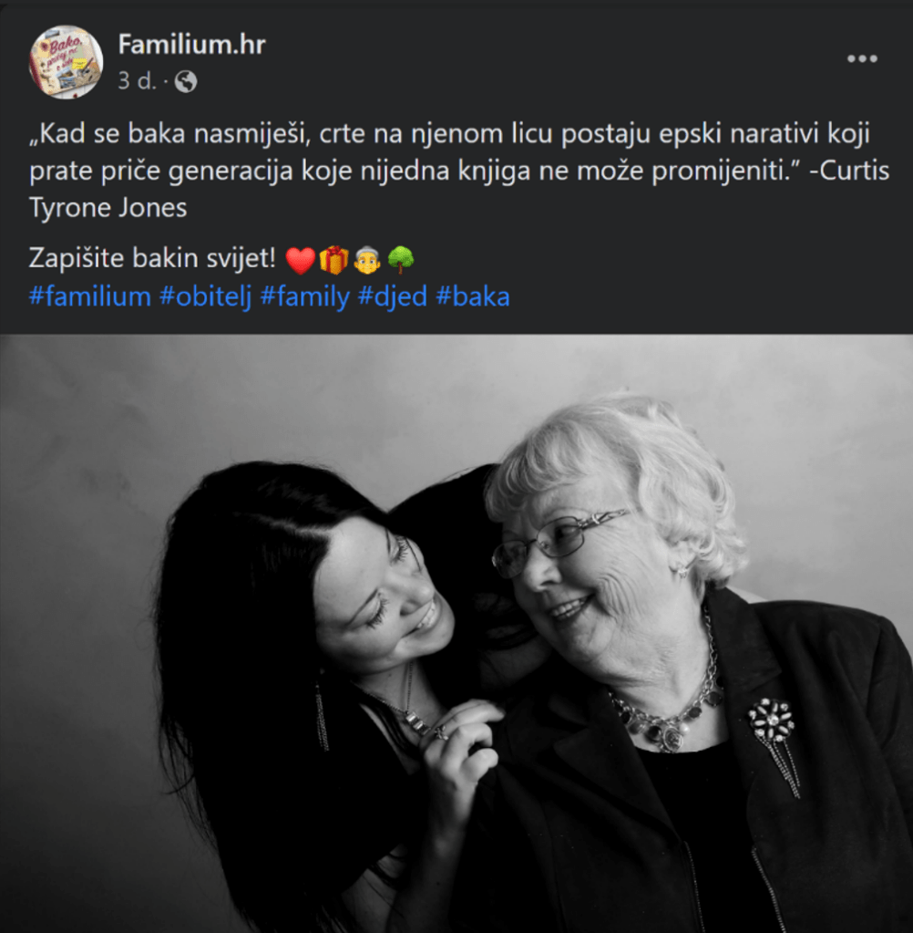 3. Kako ne bi samo isticali ponudu onoga što nude, trude se i zbližiti s korisnicima na emotivnoj razini. Objavili su fotografiju bake i unuke čijim opisom prodiru u dušu istovremeno koristeći poziv na akciju – frazu koja će vam pomoći generirati prihode.