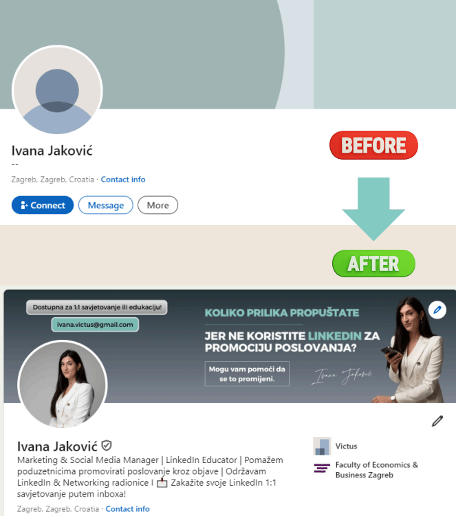 U sklopu usluge “Uređivanje profila” s vama radim na vizualnom i tekstualnom poboljšanju vašeg profila, a u sklopu LinkedIn savjetovanja radimo puno više od toga jer se bavimo i kreiranjem sadržaja.